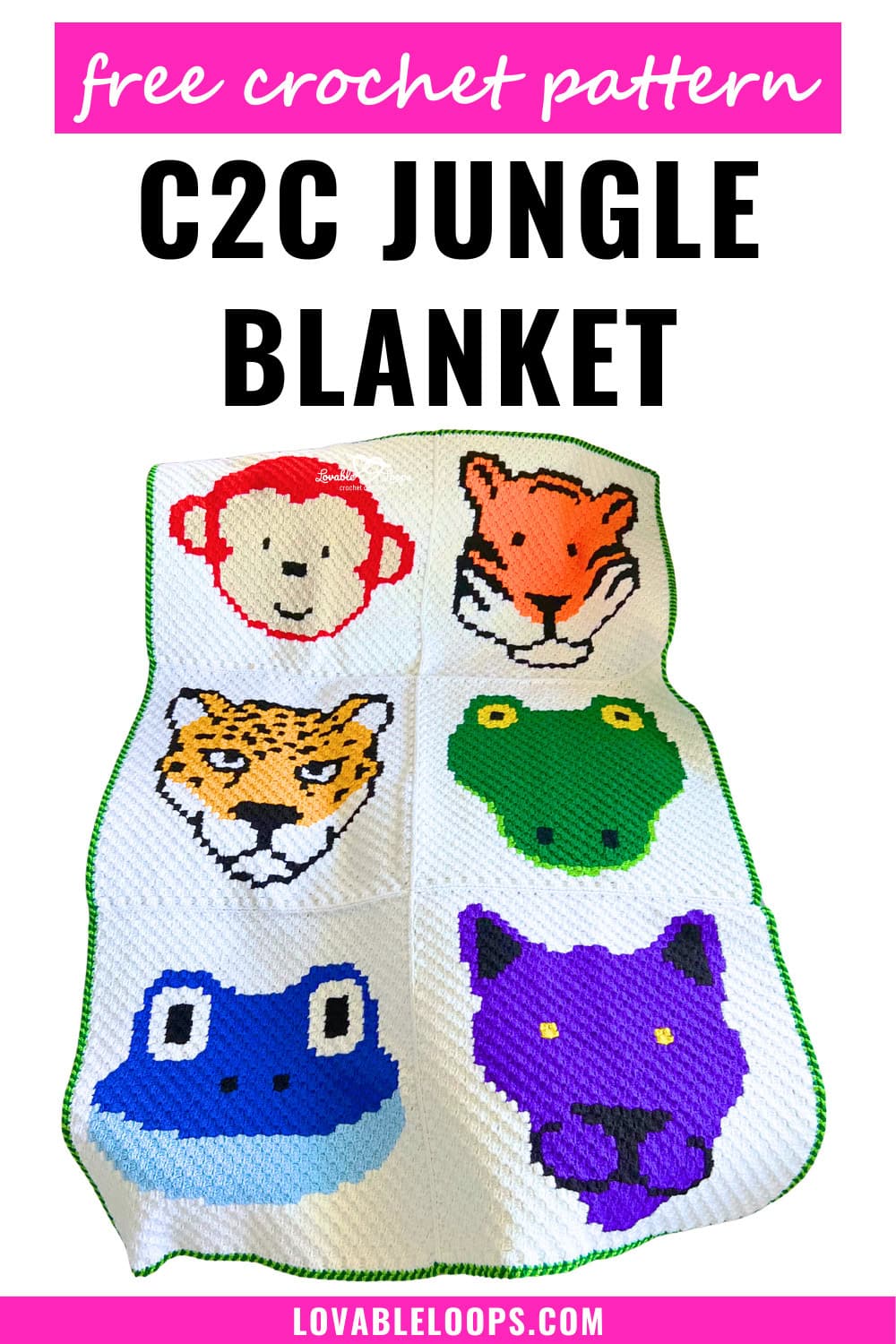 This jungle animals crochet baby blanket pattern is a corner-to-corner (C2C) blanket made from six individual animal panels (monkey, tiger, jaguar, alligator, frog, panther). Each panel is worked in diagonal rows using the C2C method with simple color changes, then the panels are sewn together and finished with a simple border.